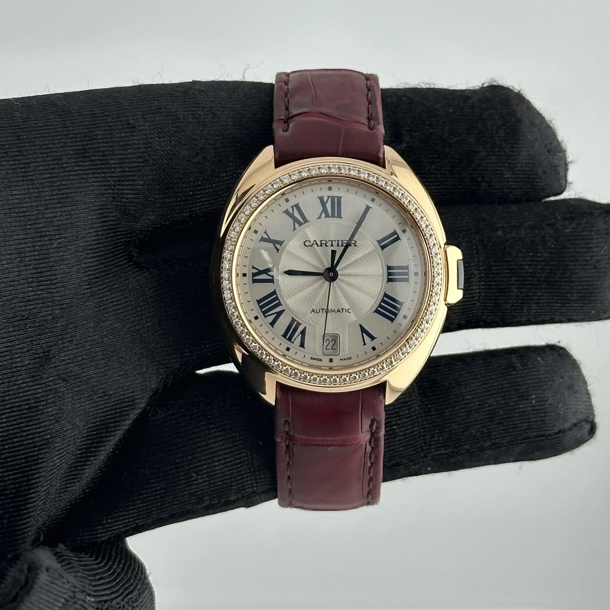 Cartier Cle Silver Roman Dial on Maroon Leather Ref 3854 with Papers 2019