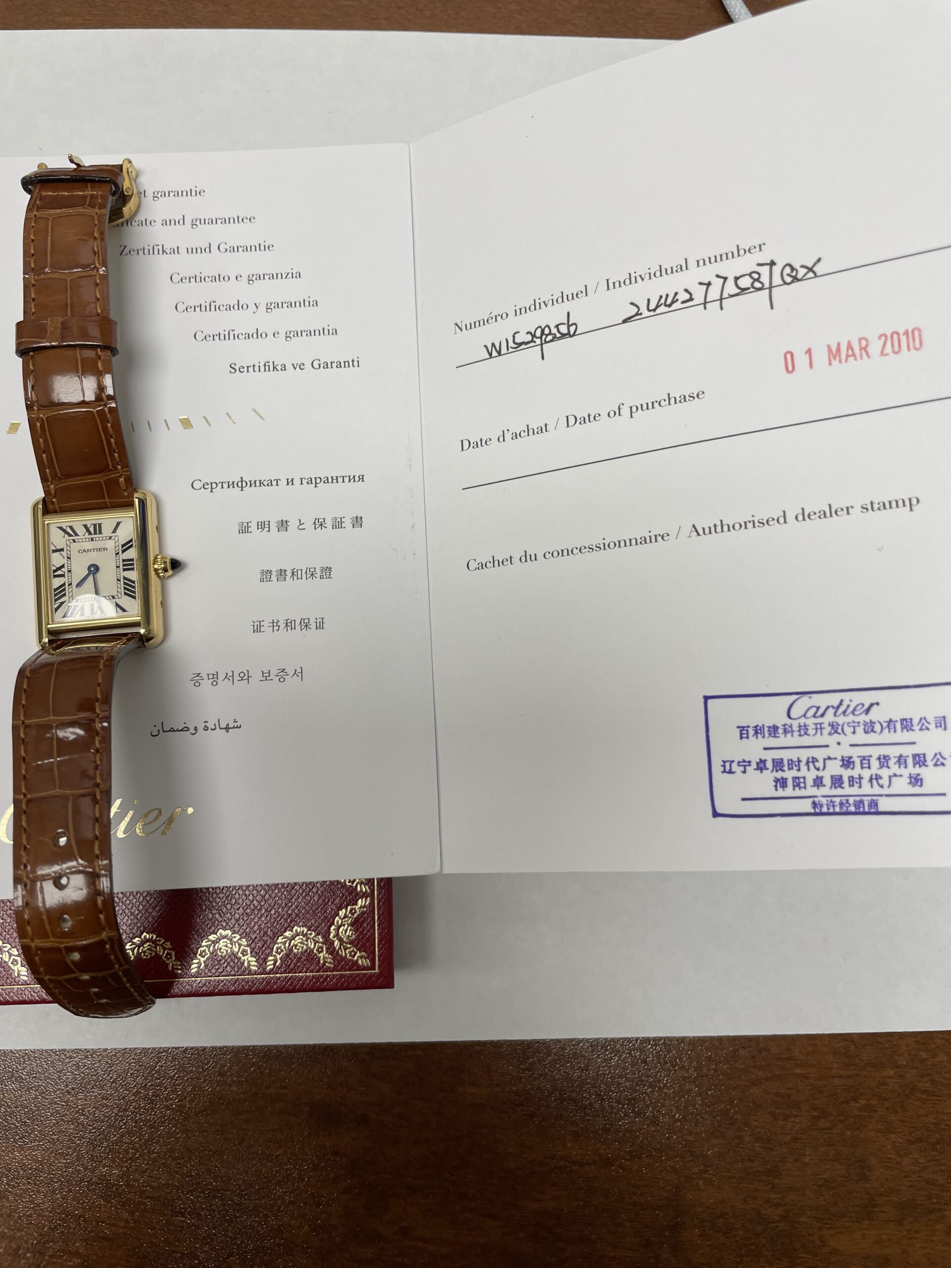 Cartier Tank White Dial on Leather Ref 2442 with Papers 2010