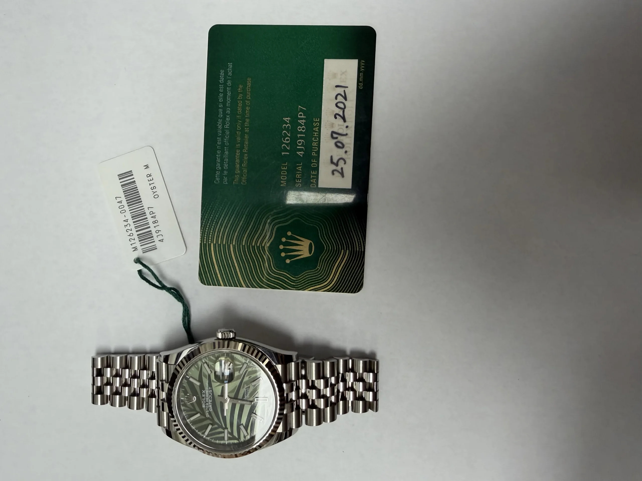 Rolex Datejust Olive Green Palm Motif Dial on Jubilee Ref 126234 with New Style Card Green 2021