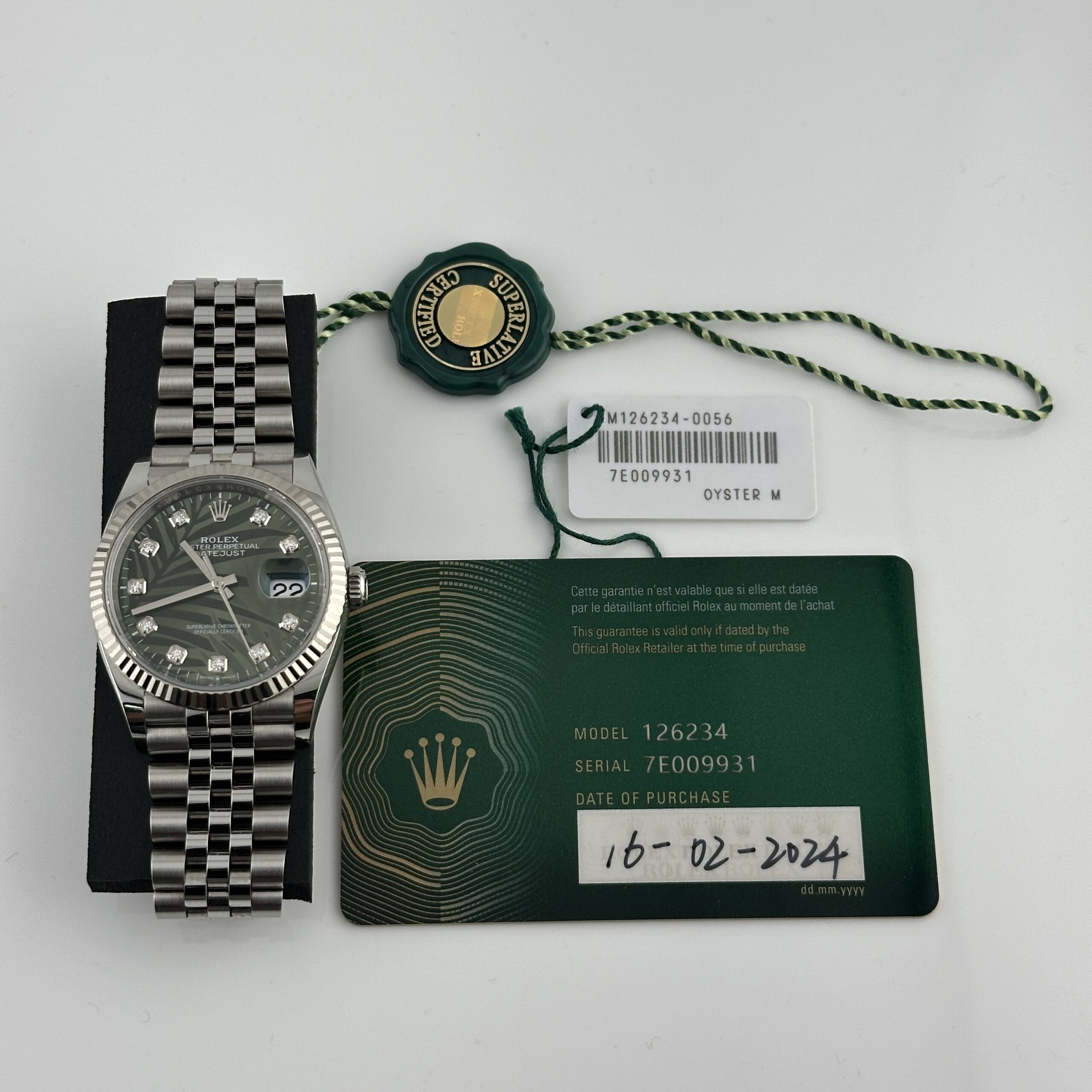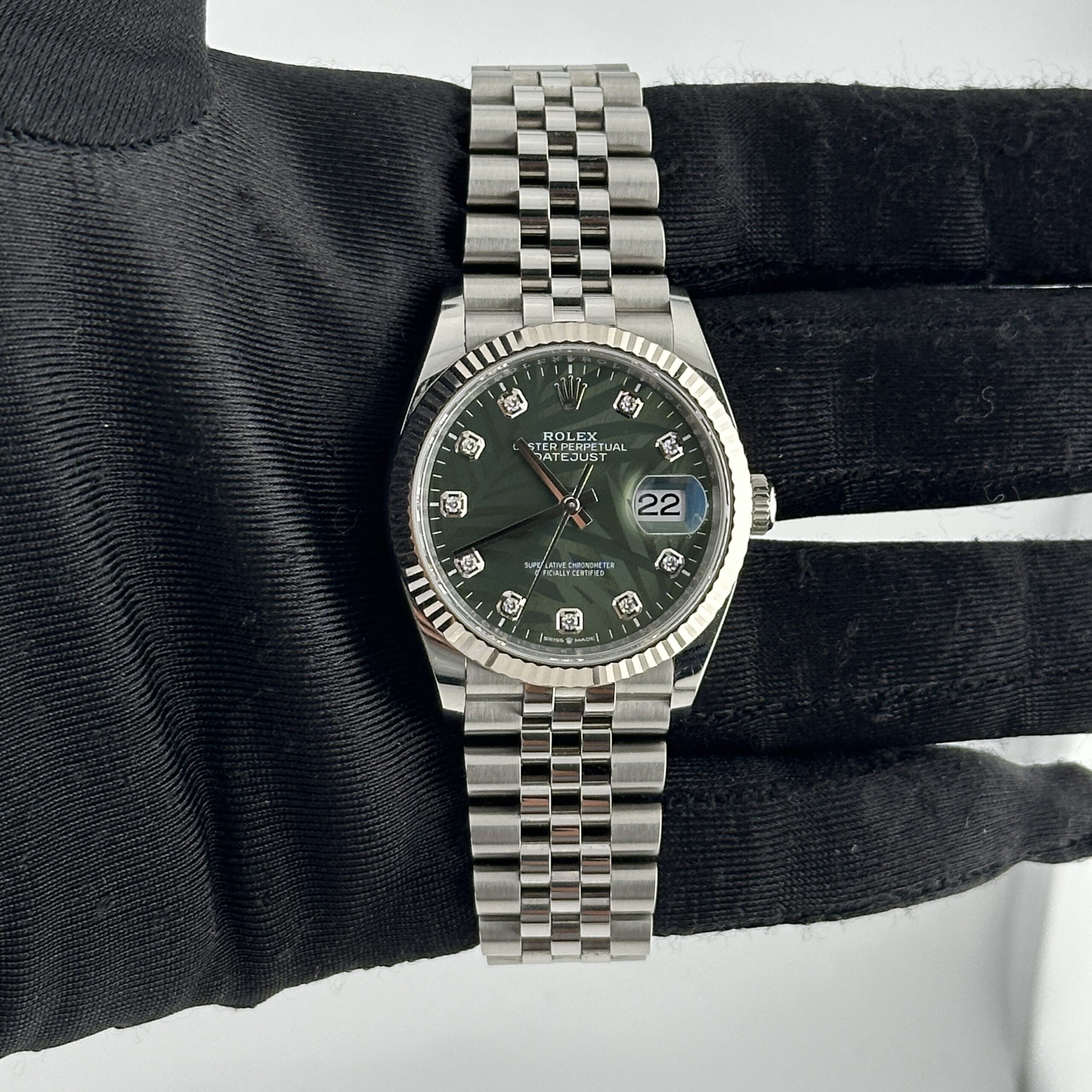 Rolex Datejust Olive Green Palm Motif Diamond 6 Dial on Jubilee Ref 126234 with New Style Card Green 2024