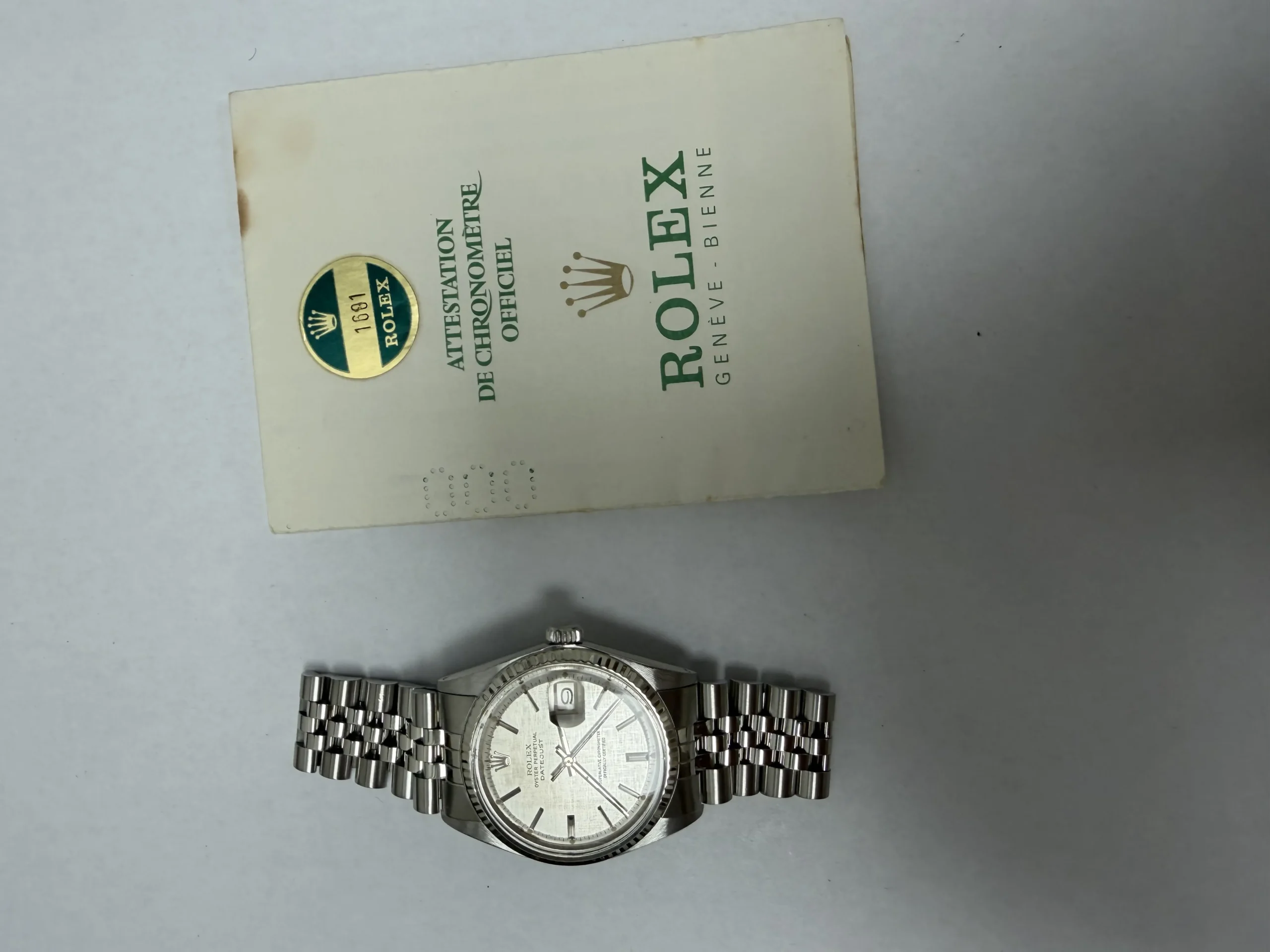 Rolex Datejust Silver Stick Dial on Jubilee Ref 1601/4 with Papers 1977