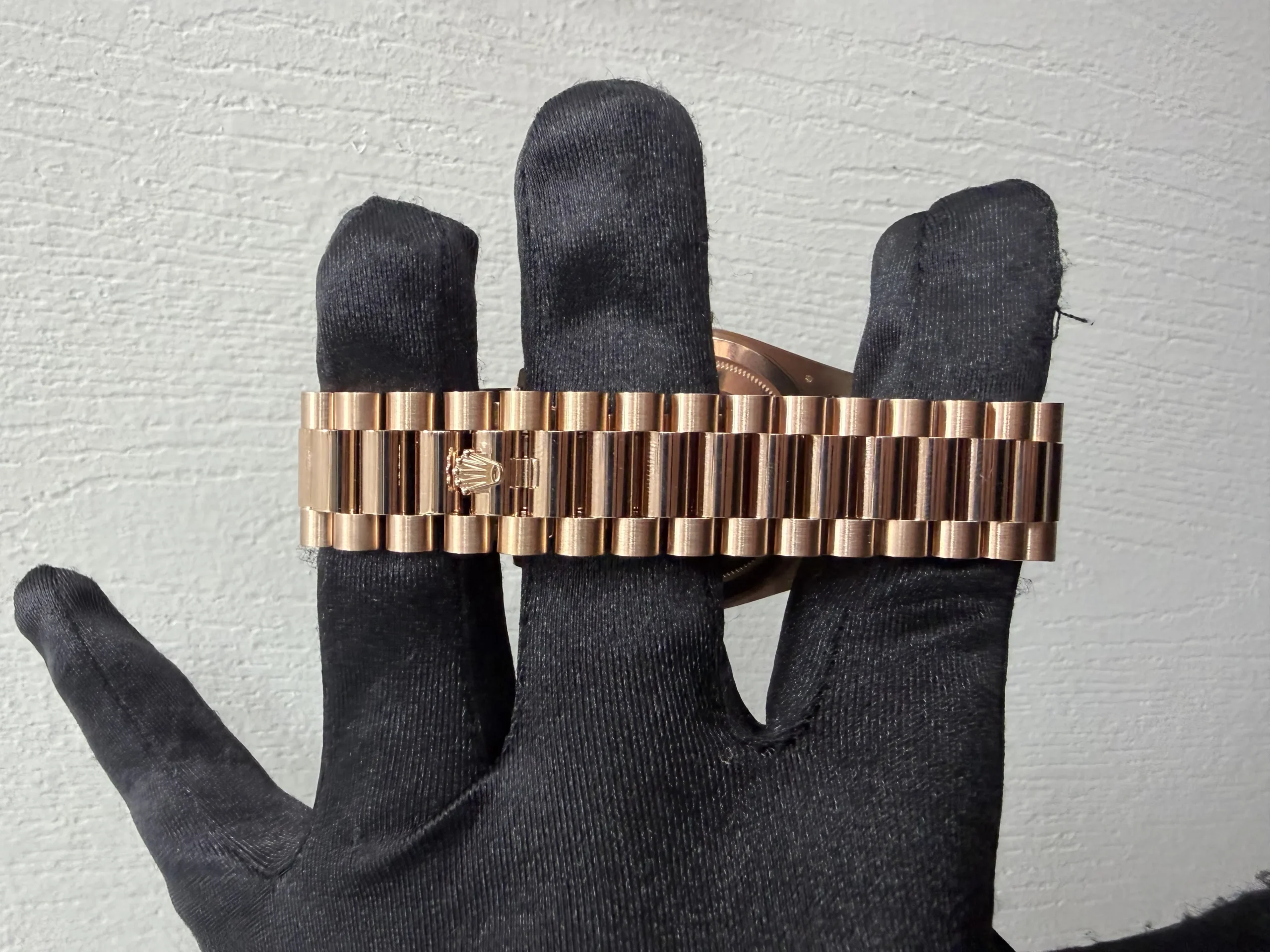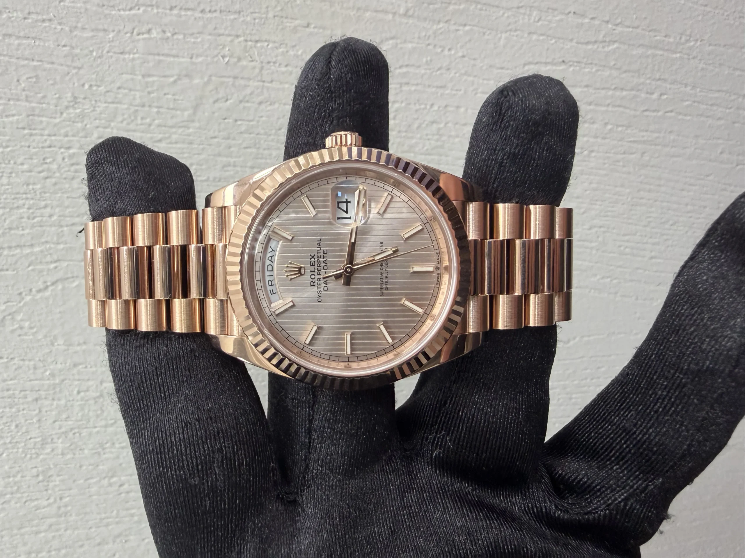 Rolex Day-Date 40 Sundust Strip Motif Index Dial on President Ref 228235 with New Style Card Green 2021