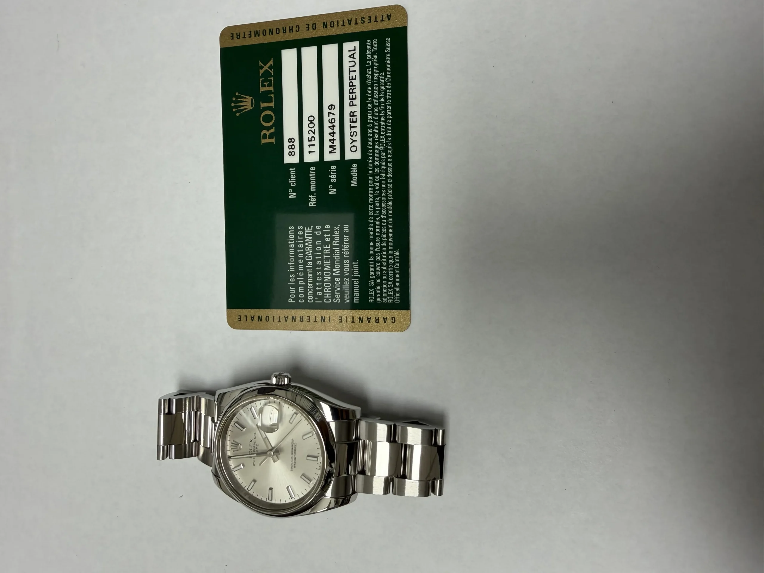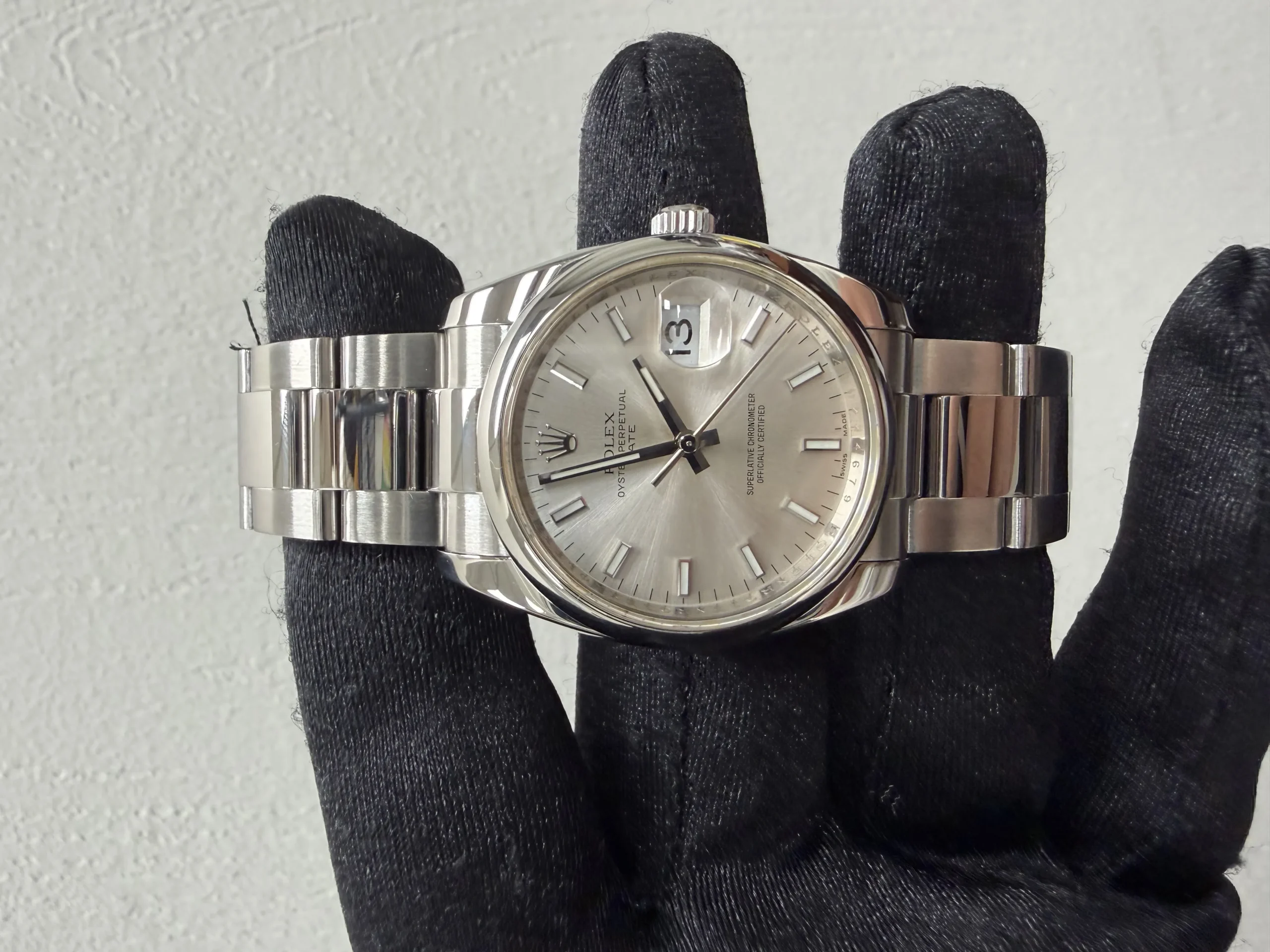 Rolex Oyster Perpetual Date Silver Stick Dial on Oyster Ref 115200 with Card Old Green 2012