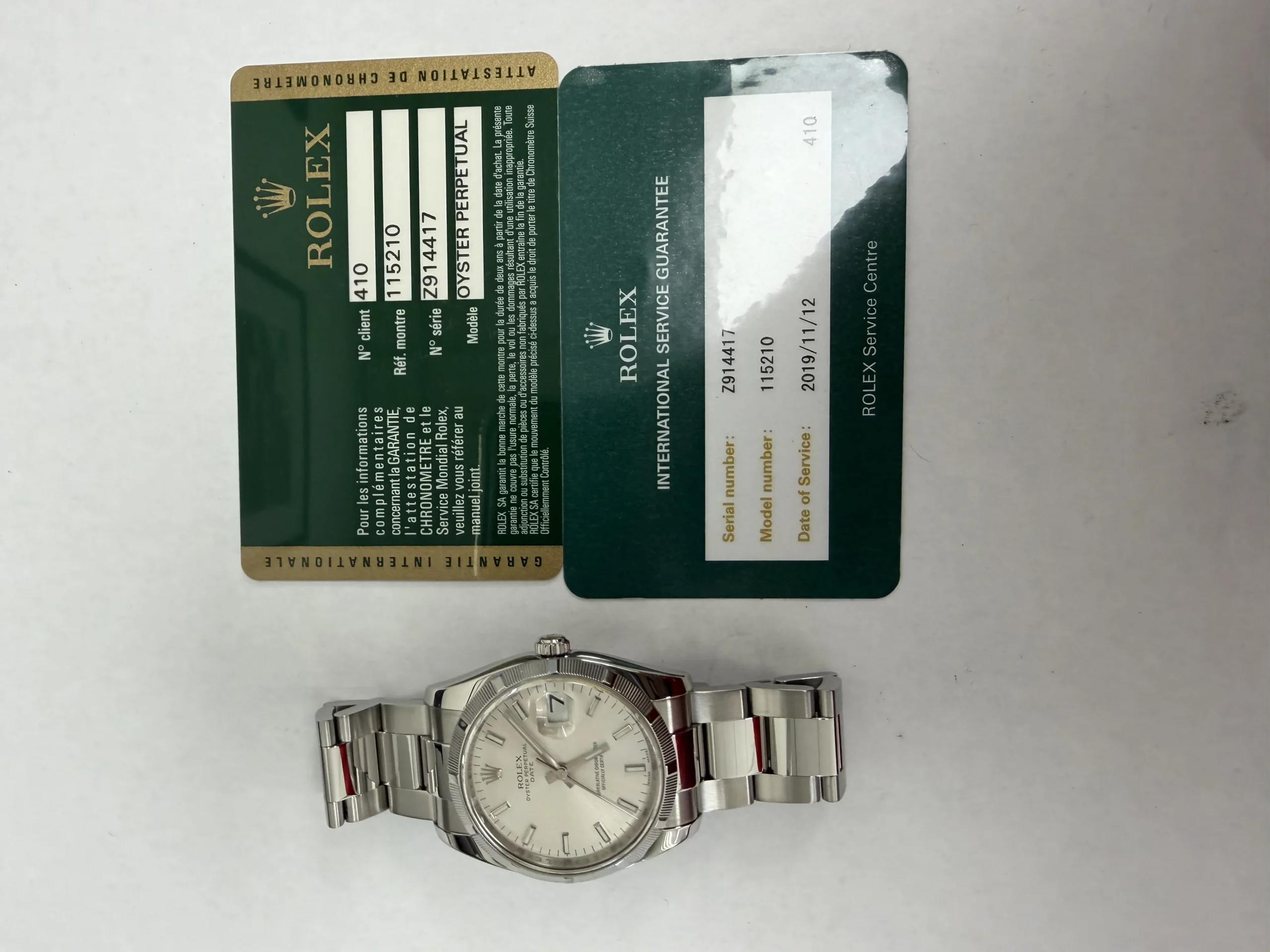 Rolex Oyster Perpetual Date Silver Stick Dial on Oyster Ref 115210 with Card Old Green 2009